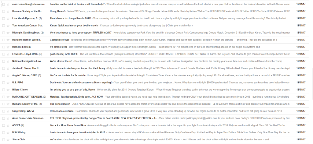 In the face of this uncertainty, EOY 2017 showed some stability. Solid growth, continued innovation from nonprofits expanding into digital ads and other strategies, and reliable donor response. Deadline messaging gets the last-minute procrastinators to give. Sending email appeals to active supporters still drives revenue. Digital ads that follow users around the internet with sad puppies or starving children or environmental disasters work to keep issues in the forefront and convert new audiences.