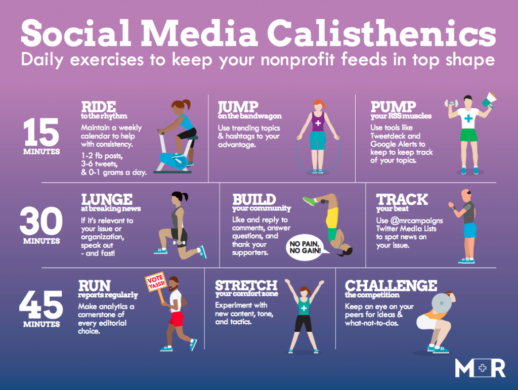 Sometimes it feels like there’s no time to squeeze in the good practices you know are going to keep your social media communities performing in top shape for your cause. So we’ve put together a little exercise regimen to help make the most of every minute and keep moving forward toward our goals.