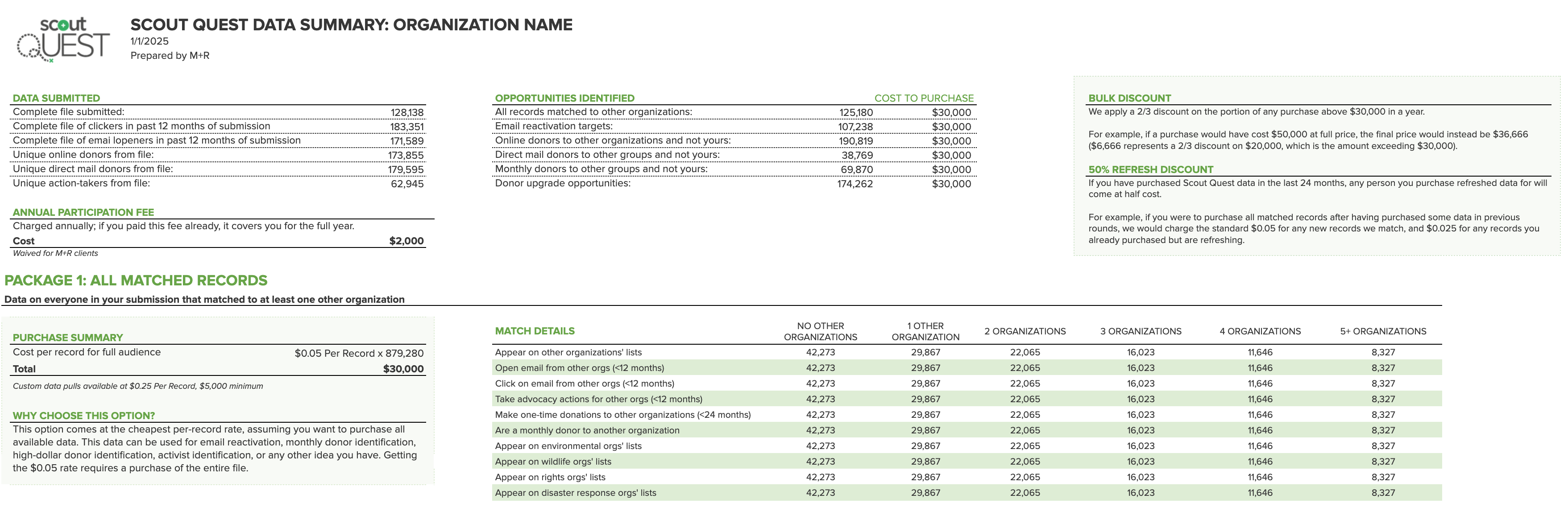 Scout Quest is M+R’s ethical online data co-op, where organizations pool together their data to learn more, target better, and raise more from their supporters — all while respecting email opt-in and data privacy requirements.