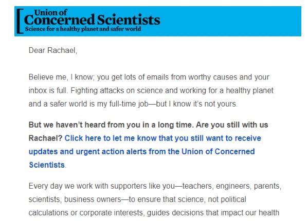 You can also do this right before a supporter’s email address goes inactive (you are suppressing inactive emails, right?). Targeting folks with an action that’s easy to complete when they haven’t interacted with your messages for a few months keeps your messages at the top of their inbox. And if it’s been a while since you’ve heard from them, you can automatically send them a message confirming they want to continue getting emails—keeping the engaged supporters and releasing the ones who want off your list.