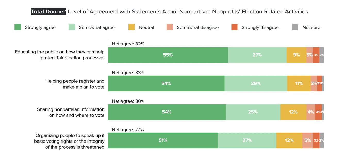 And that’s not all. The majority of donors strongly agree that nonpartisan nonprofits should engage in a range of nonpartisan election-related activities to protect fair election processes, help citizens navigate the voting system, and ensure the integrity of the democratic process is upheld.