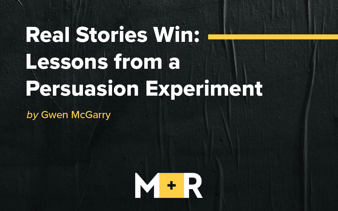 We just hung up from our lively webinar releasing our latest white paper, Real Stories Win: Lessons from a Persuasion Experiment, featuring author Gwen McGarry (Senior Vice President, M+R), Tiffany Ricci (Director of Communications, AFSCME), and Brianna Twofoot (Vice President, Organizing, Elections and Campaigns, Planned Parenthood Action Fund).